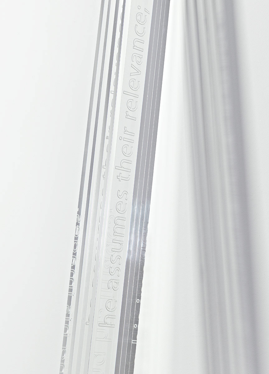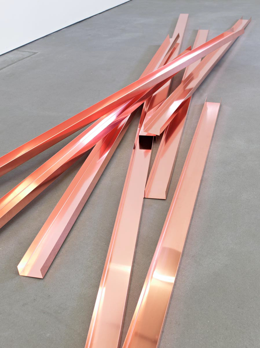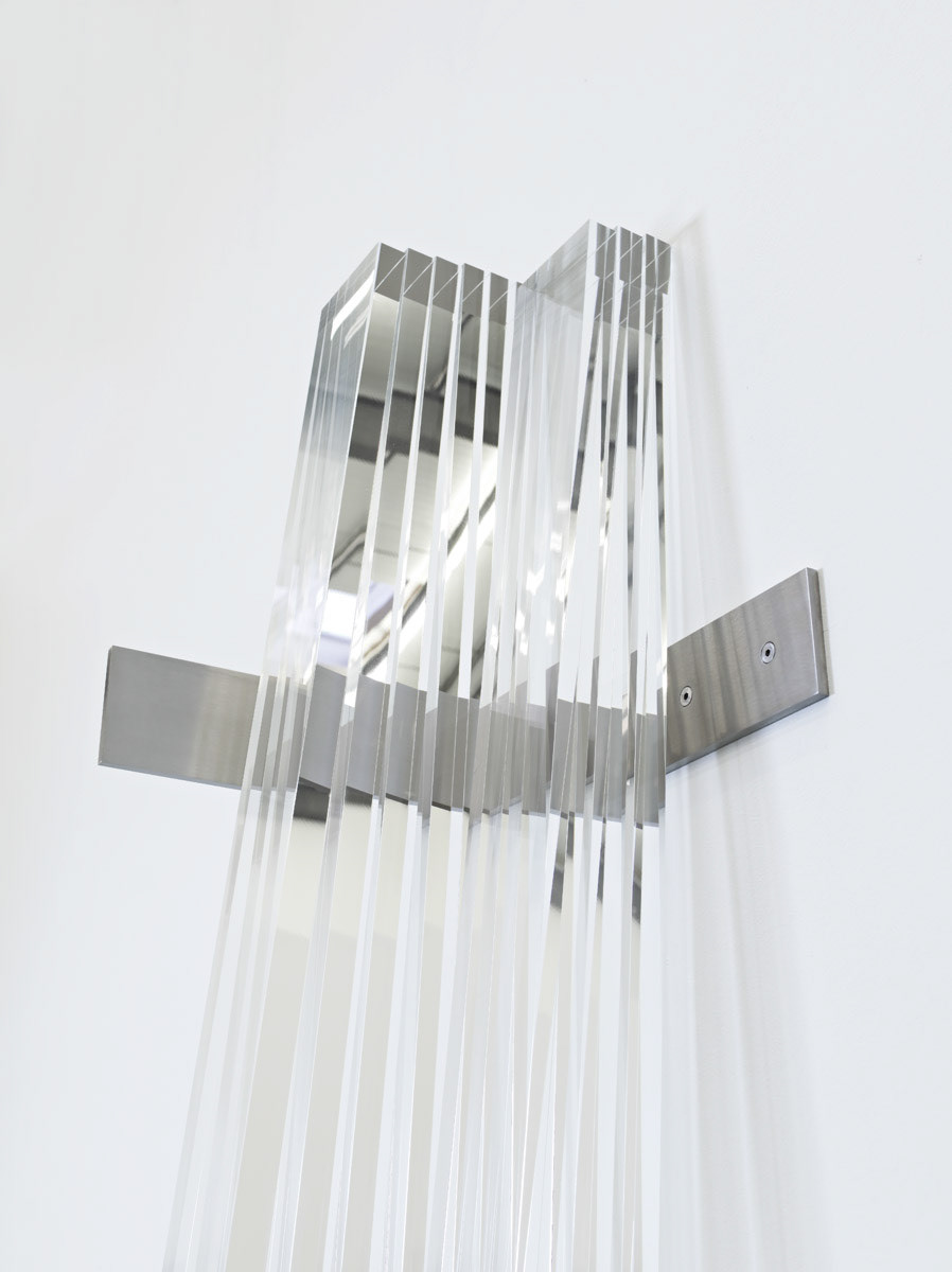 Exhibition views: Natalia Stachon. All that is solid melts into air, Loock Galerie, Berlin, 2009 / works in exhibition: Thinking 02, 2009, 17 plexiglass bars, stainless steel angle, engraving, overall dimensions variable, Ed. 1/1, Thinking 04, 2009, plexiglass, stainless steel, engraving, 17 x 14 x 250 cm, ed. 1/1, Blinding 01, 2009, 8 copper profiles, 250 x 8 x 3,7 each, overall dimensions variable, Ed. 1/1, Entropy 02, 2009, pencil on paper 83.4 x 298.5 x 5 cm, Entropy 01, 2009, pencil on paper, 280 x 85 x 5 cm, Zoning 02, 2009, plexiglass, wood, paint, 52 x 48 x 158 cm, Ed. 1/3 (Photos: Jörg von Bruchhausen)