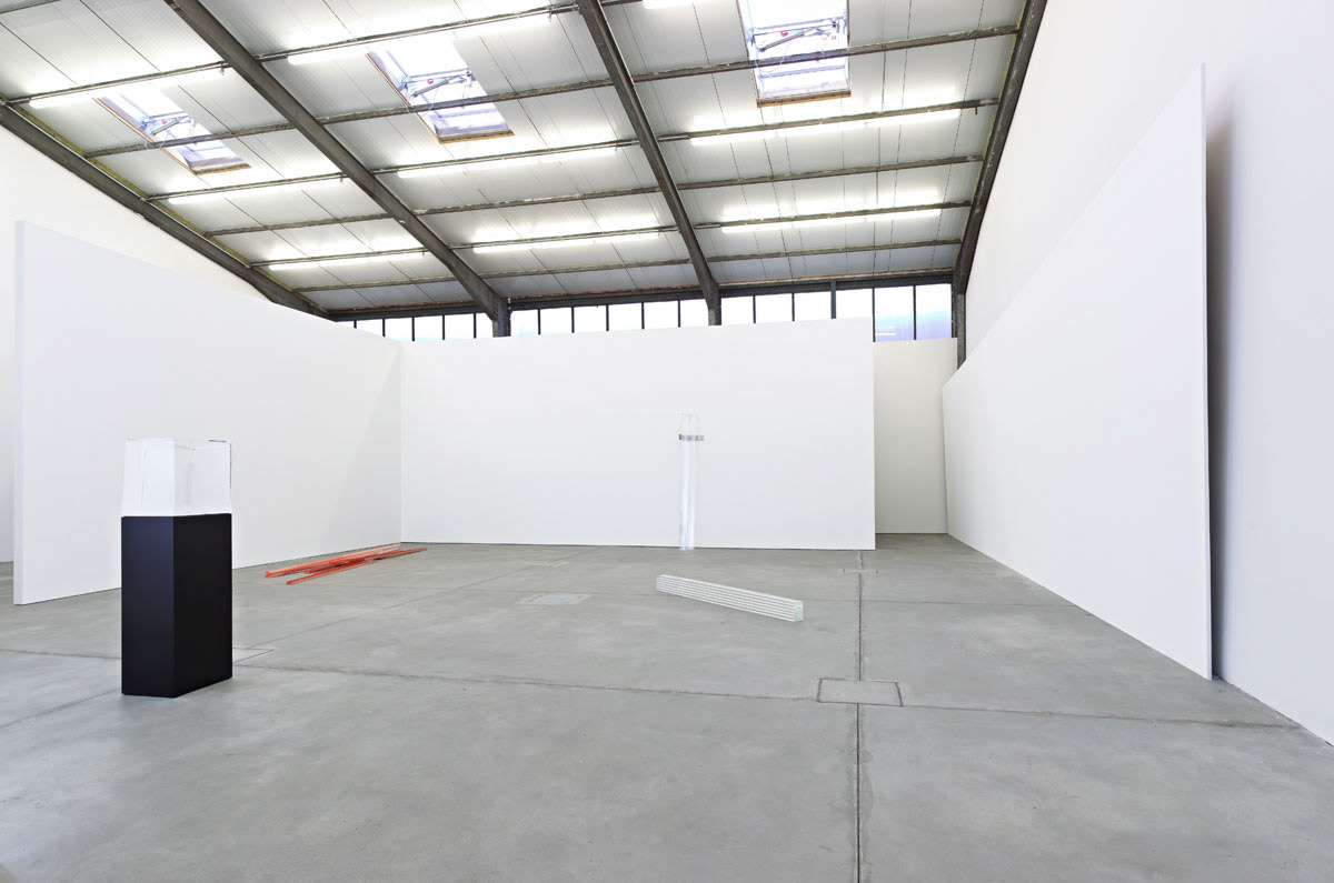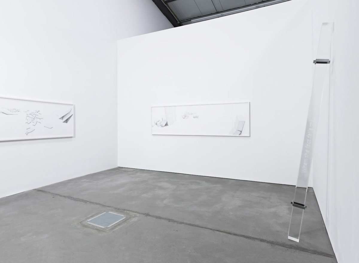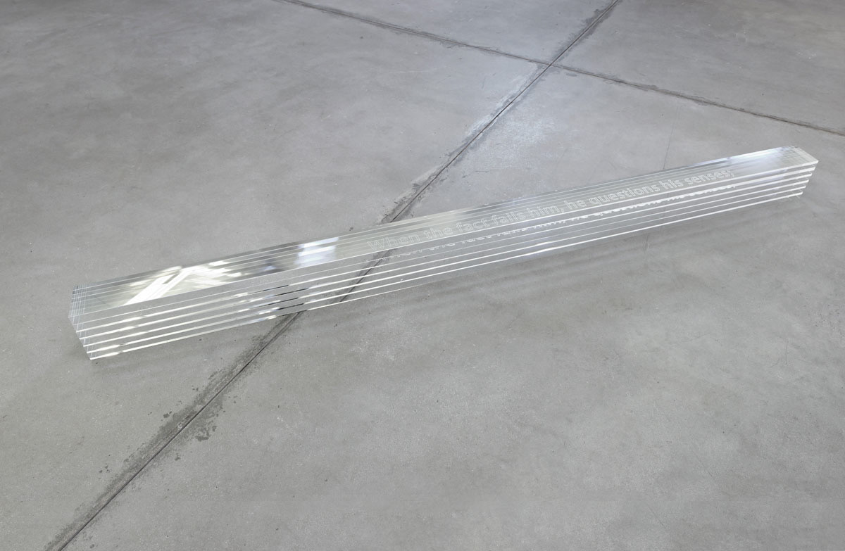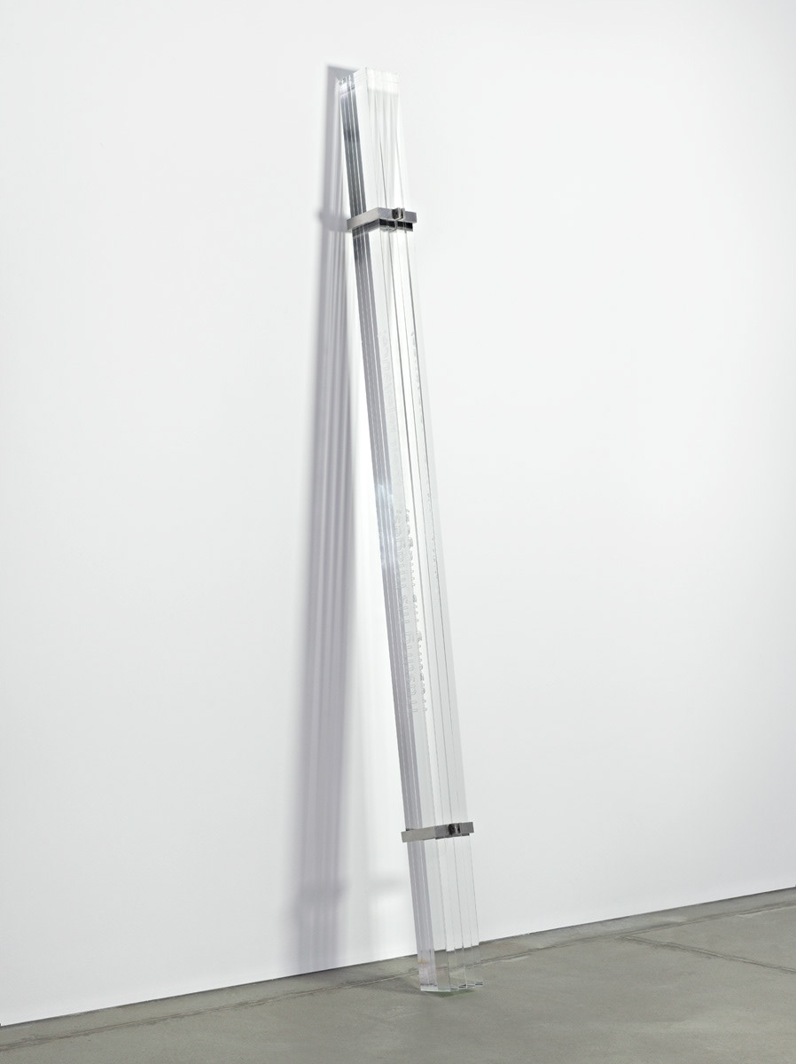 Exhibition views: Natalia Stachon. All that is solid melts into air, Loock Galerie, Berlin, 2009 / works in exhibition: Thinking 02, 2009, 17 plexiglass bars, stainless steel angle, engraving, overall dimensions variable, Ed. 1/1, Thinking 04, 2009, plexiglass, stainless steel, engraving, 17 x 14 x 250 cm, ed. 1/1, Blinding 01, 2009, 8 copper profiles, 250 x 8 x 3,7 each, overall dimensions variable, Ed. 1/1, Entropy 02, 2009, pencil on paper 83.4 x 298.5 x 5 cm, Entropy 01, 2009, pencil on paper, 280 x 85 x 5 cm, Zoning 02, 2009, plexiglass, wood, paint, 52 x 48 x 158 cm, Ed. 1/3 (Photos: Jörg von Bruchhausen)