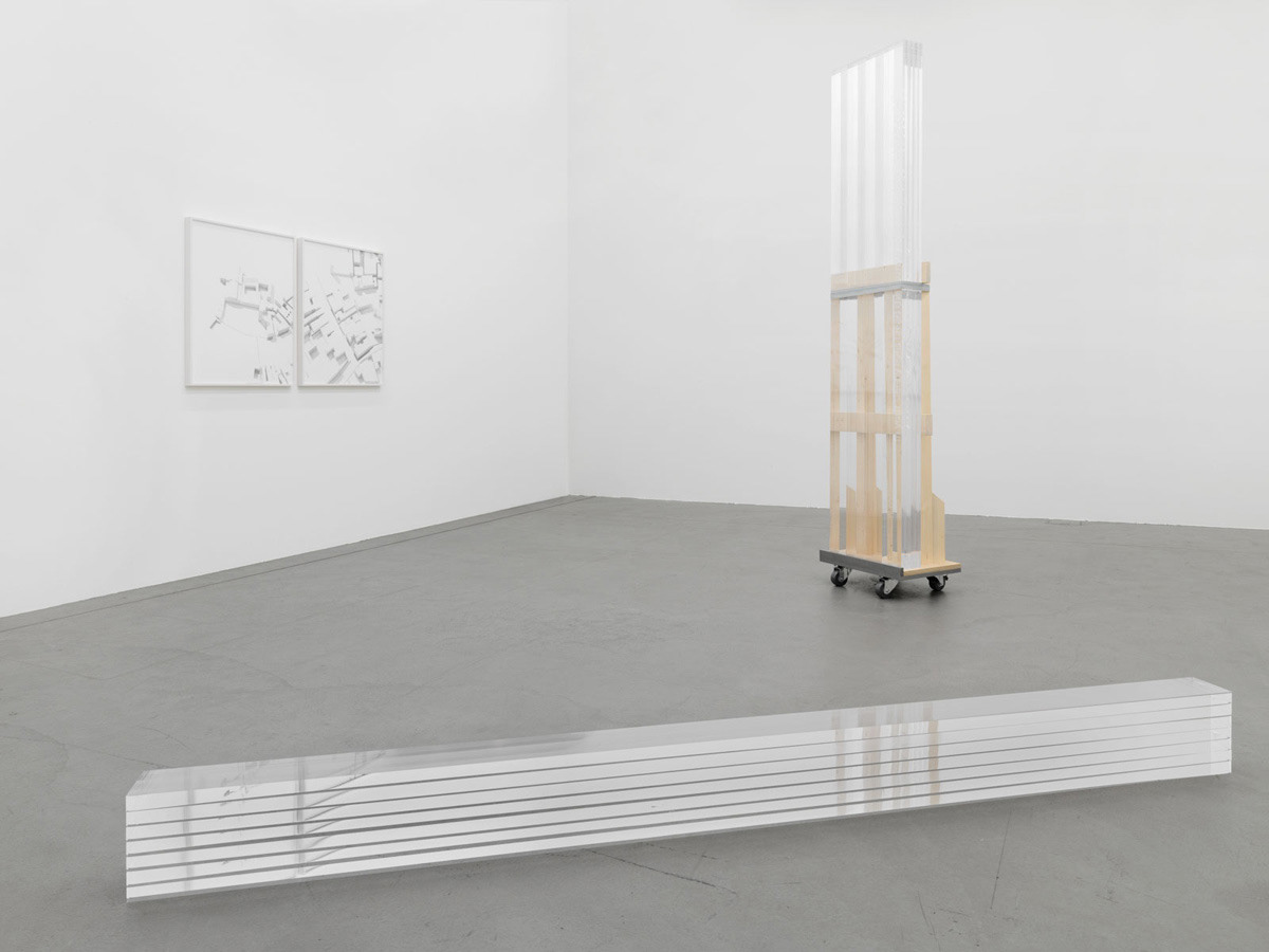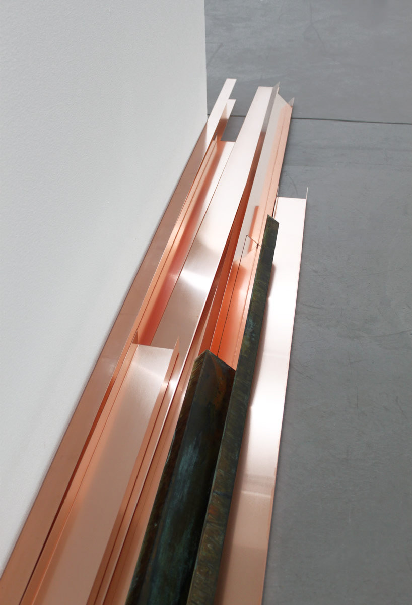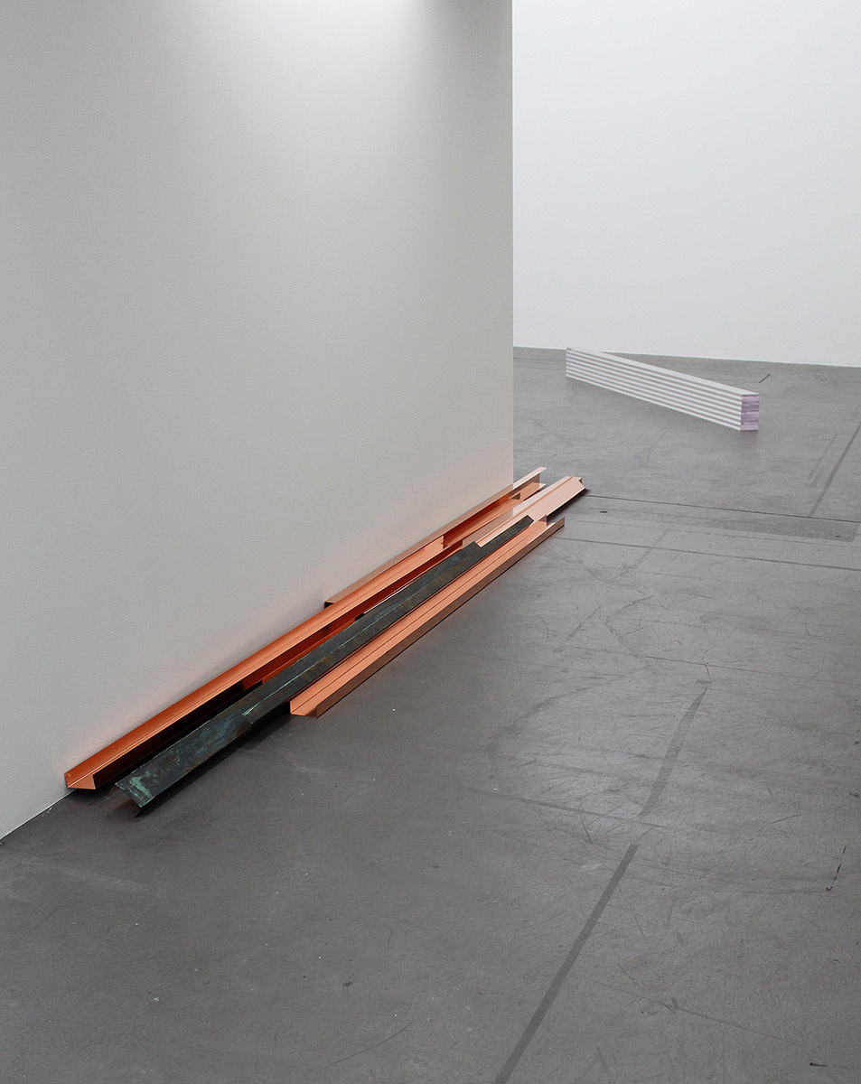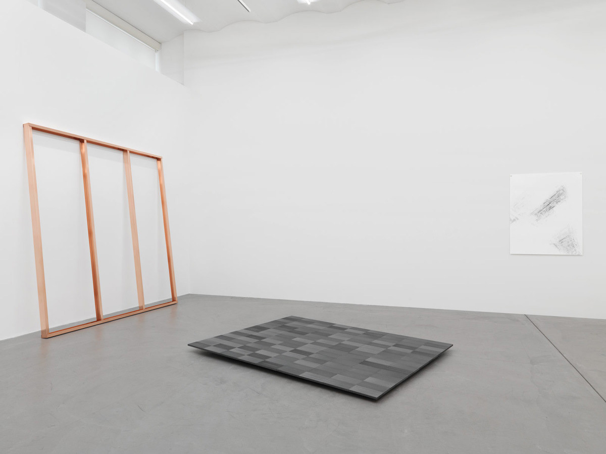 Exhibition views: Natalia Stachon. Matter shifted, Museum Haus Konstruktiv, Zurich, 2010 (Photos: A. Burger) / works in exhibition: Ajar, 2010, 6 copper profiles, magnets, steel, 250 x 250 x 8,7 cm, Recent 02, 2009, 135 graphite tiles, wood, 216 x 172,5 x 9 cm, Roamer, 2010, wooden cart, belt, 23 plexiglass bars, overall dimensions variable, Rendering 01-03, 2010, silkscreens on paper, magnets, steel, 120 x 95 each, Territories 06 and 07, 2010 pencil on paper, 90 x 70 cm, each, Blinding 02, 2010, 9 copper profiles, 2 with patina, 250 x 8 x 3.7 cm each, overall dimensions variable, ed. 1/1