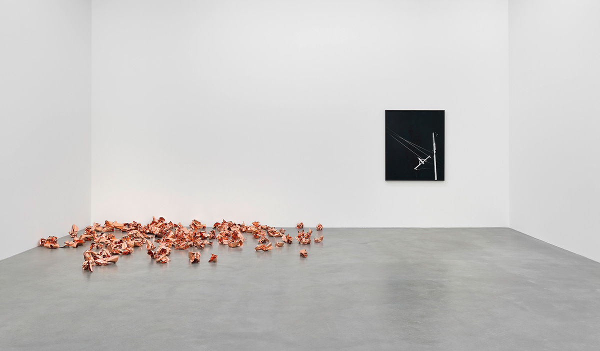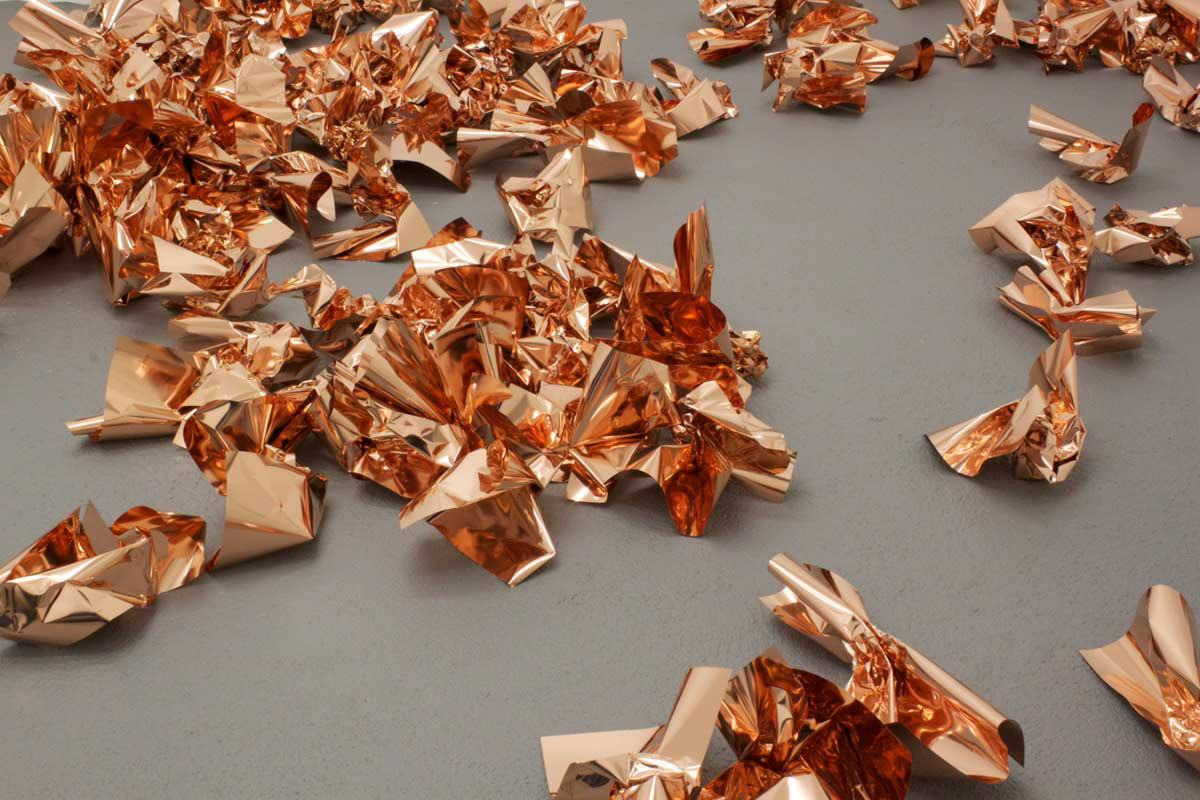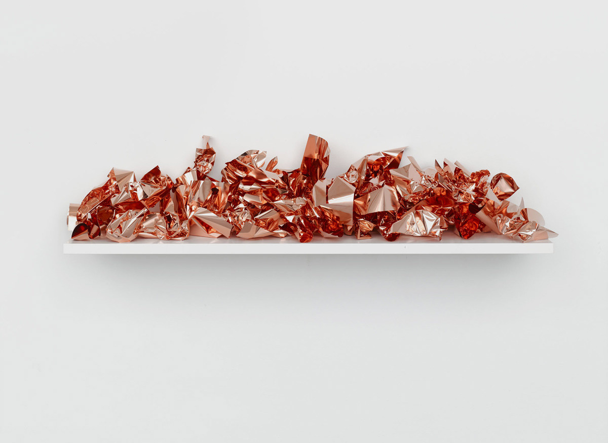 Exhibition views: PEAC Paul Ege Art Collection, Die Kunst der Faltung. Einknicken oder Kante zeigen, Freiburg 2015 and Museum für konkrete Kunst, Ingolstadt, 2014 / works in exhibition: Raj, 2011, polished copper sheets, A4 size each, overall dimensions variable, Raj, 2012, 43 polished and crumbled, copper pieces, wood, white paint, 130 x 30 x 30 cm, The History of Aberrations, 2015 (Photos: Bernhard Strauss, Bernd Borchardt and others)