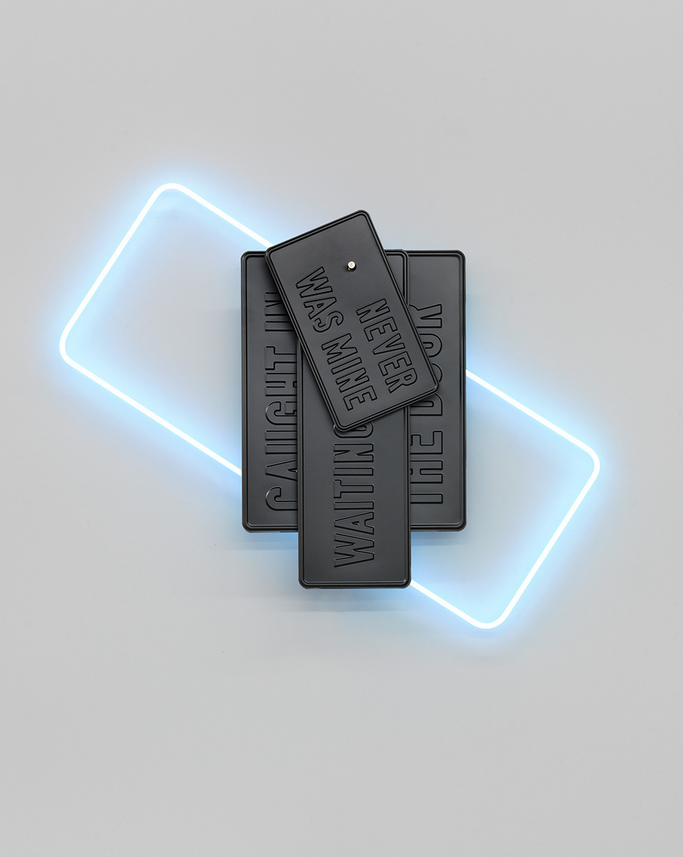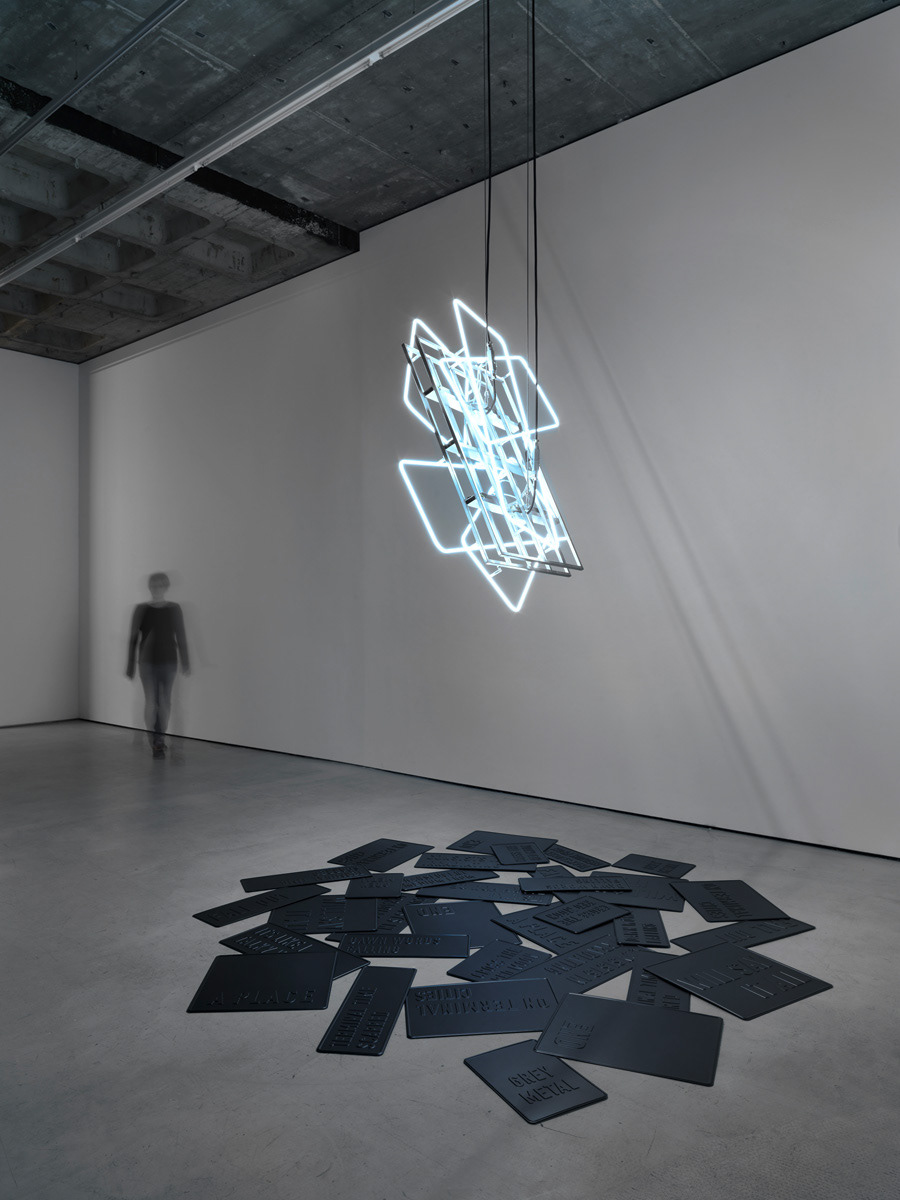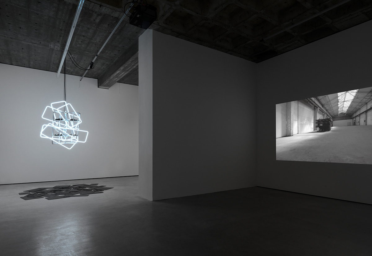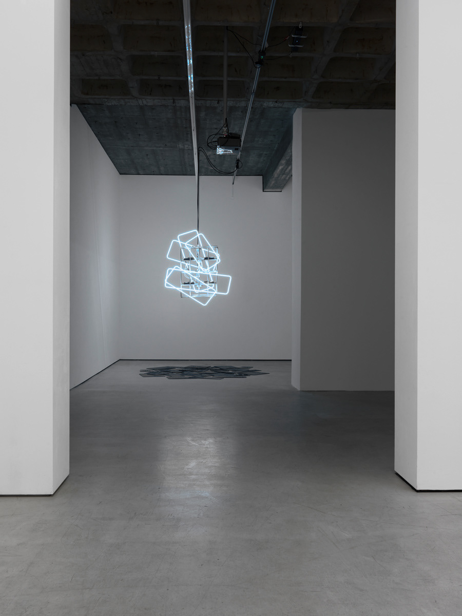 Exhibition view: Natalia Stachon. Omitted Center, Loock Galerie, Berlin, 2015 / works in exhibition: Blue Silence in the Turnstile 01, 2015, mixed media installation, dimensions variable, Circumference, 2015, HD-Video, loop, Never was mine, 2015, sculpture, 3 signs (aluminum with rubber), neons with accessories, stainless steel holder, 96 x 80 x 14 cm (Photos: Bernd Borchardt)
