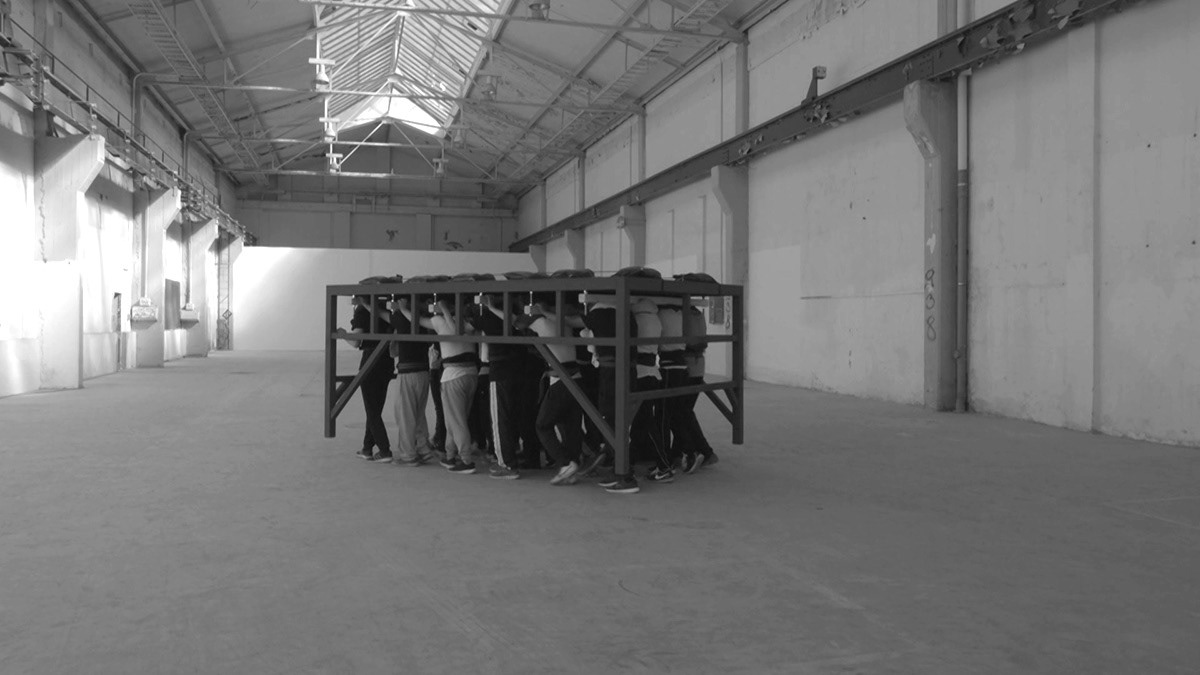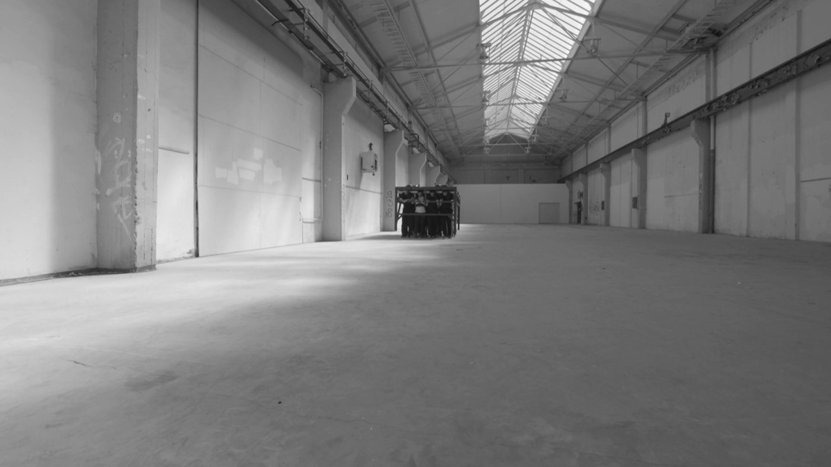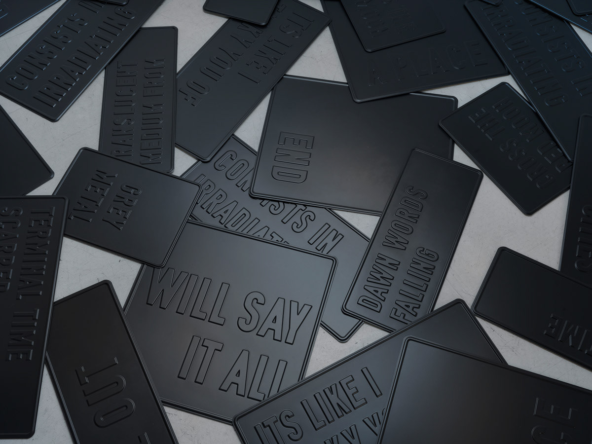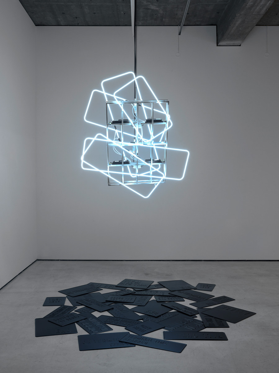 Exhibition view: Natalia Stachon. Omitted Center, Loock Galerie, Berlin, 2015 / works in exhibition: Blue Silence in the Turnstile 01, 2015, mixed media installation, dimensions variable, Circumference, 2015, HD-Video, loop, Never was mine, 2015, sculpture, 3 signs (aluminum with rubber), neons with accessories, stainless steel holder, 96 x 80 x 14 cm (Photos: Bernd Borchardt)