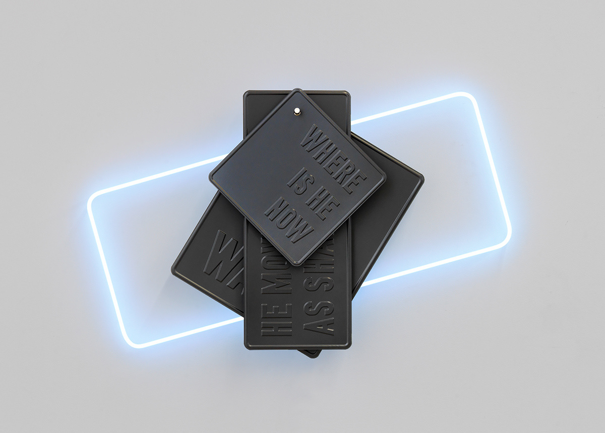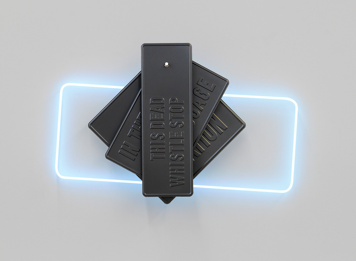 Never was mine, 2015, 3 signs (aluminum with rubber), neon with accessories, stainless steel holder, 96 x 80 x 14 cm, This dead whistle stop, 2015, 3 signs (aluminum with rubber), neon with accessories, stainless steel holder, 97 x 63 x 14 cm, Where is he now, 2015
