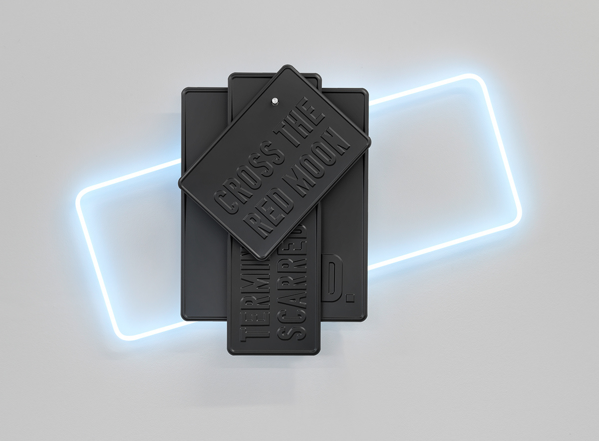 3 signs (aluminum with rubber), neon with accessories, stainless steel holder, 99 x 62 x 14 cm, Cross the red moon, 2015, aluminum, rubber, stainless steel, neon, 95 x 62 x 14 cm (Photos: Bernd Borchardt)