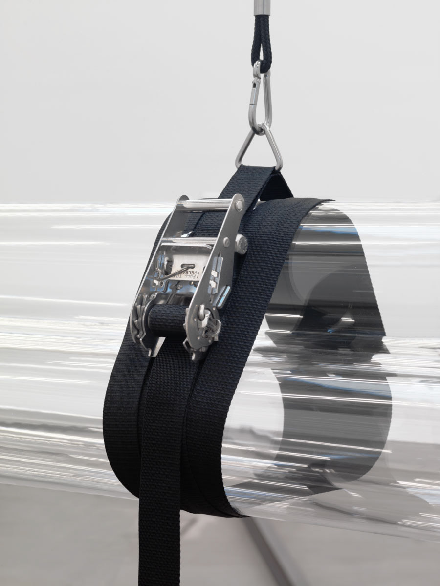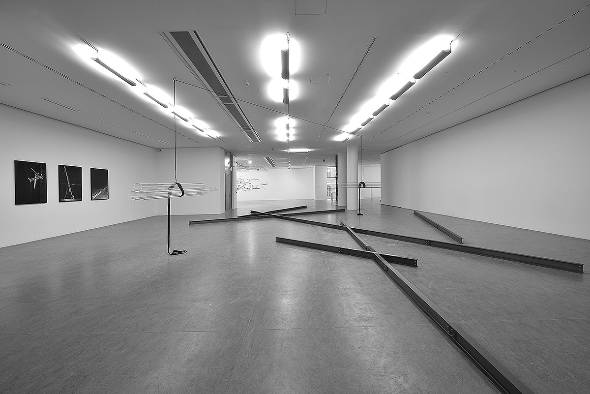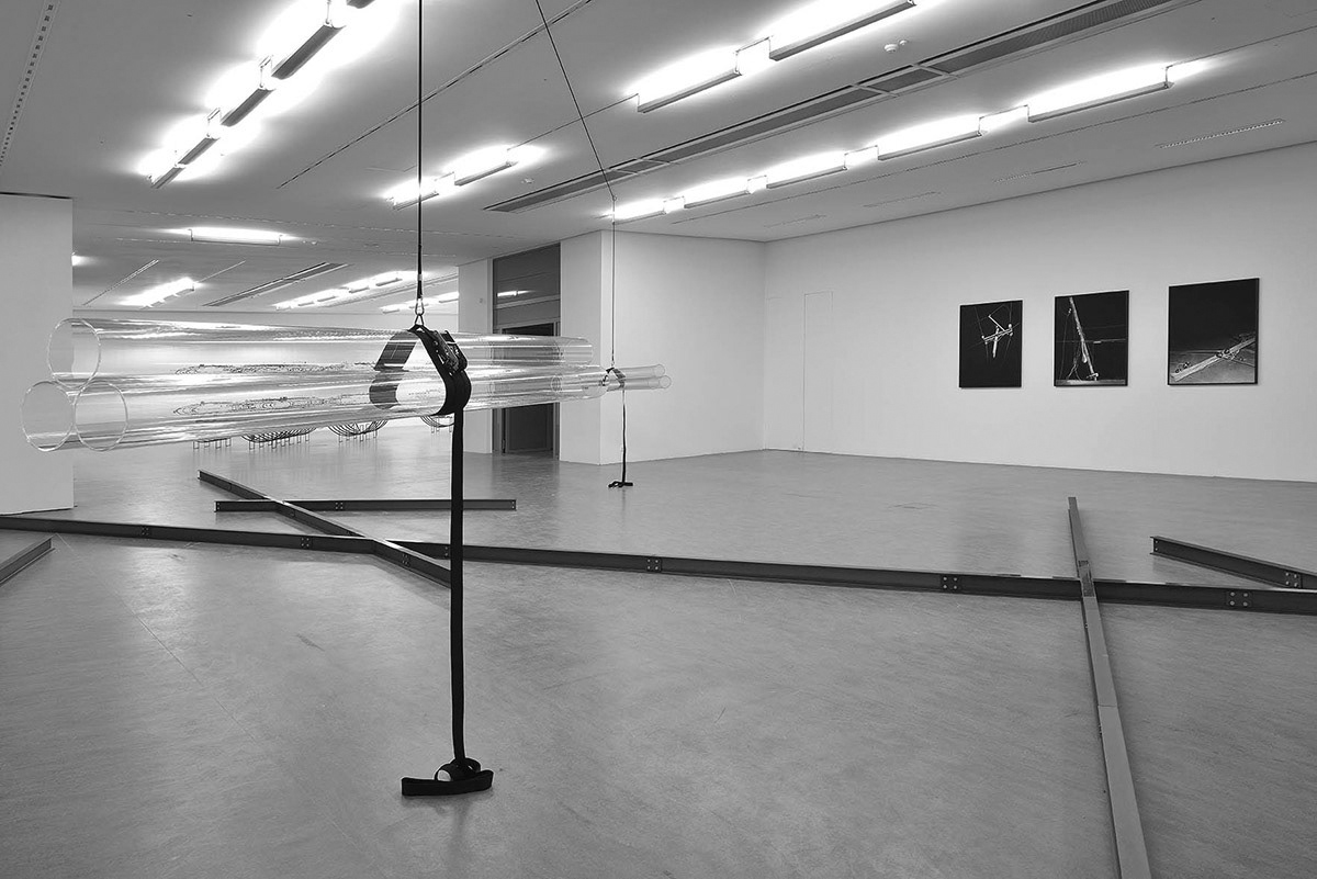 Exhibition view: Unfolding Constellations (curated by Eva Scharrer), CSW/Center of Contemporary Art, Torun/PL, 2016 / works in exhibition: Drift 03, 2012, 6 plexiglass tubes, 2 tension straps, 2 stainless steel strap tensioners, cord, stainless steel hooks, overall dimensions variable, ed. 1/1, Plot, 2012, double T-girders, partially screwed, welded, polished and loose, zinc screws, overall dimensions variable, The History of Abberations 02, 04, 05, all 2014, charcoal on mounted paper, 95 x 115 cm