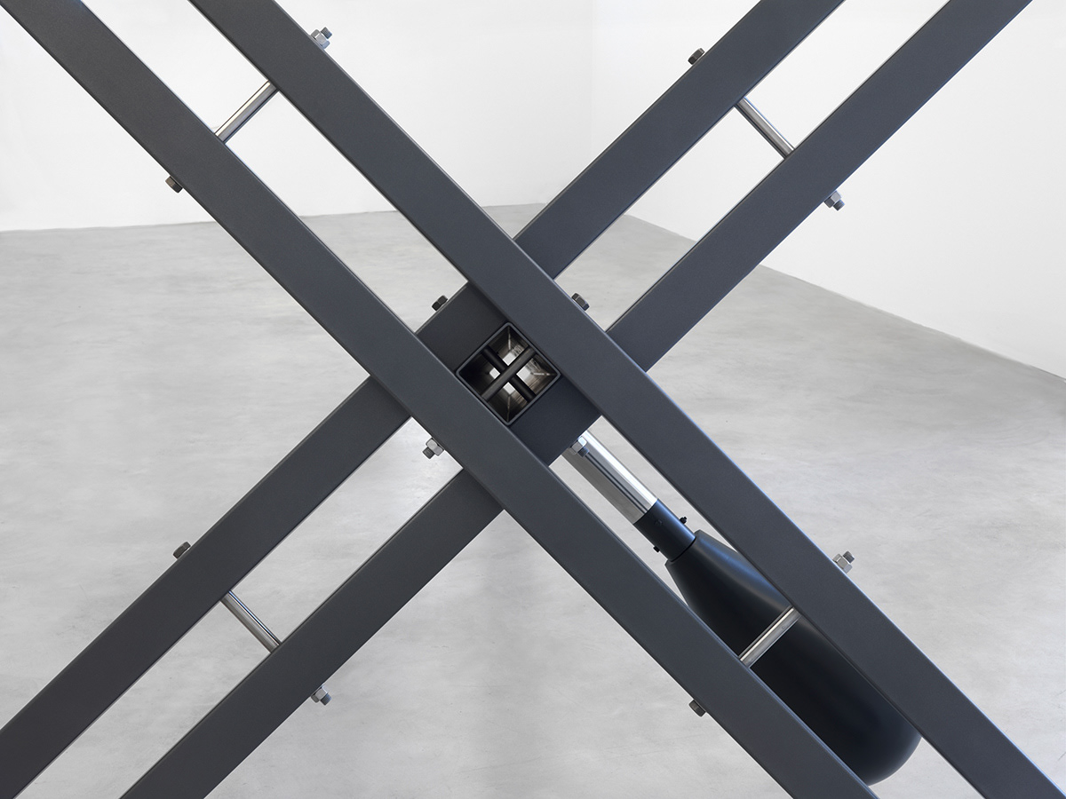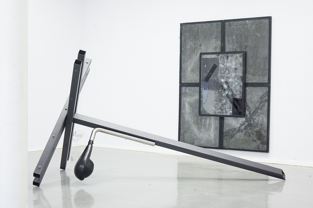 Exhibition views: How to fix a broken line (curated by Bram Braam), Kunstraum Kreuzberg Bethanien, Berlin, December 2019 (on the right: Jason Gringler) / works in exhibition: Dawn Words Falling, 2015, multipart sculpture, galvanized and stainless steel, resin with fiber glass, rubber, 320 x 250 x 250 cm and Container 09, 2013, ink-print and pencil on paper, 60 x 80 cm, ed. of 3 + 2AP