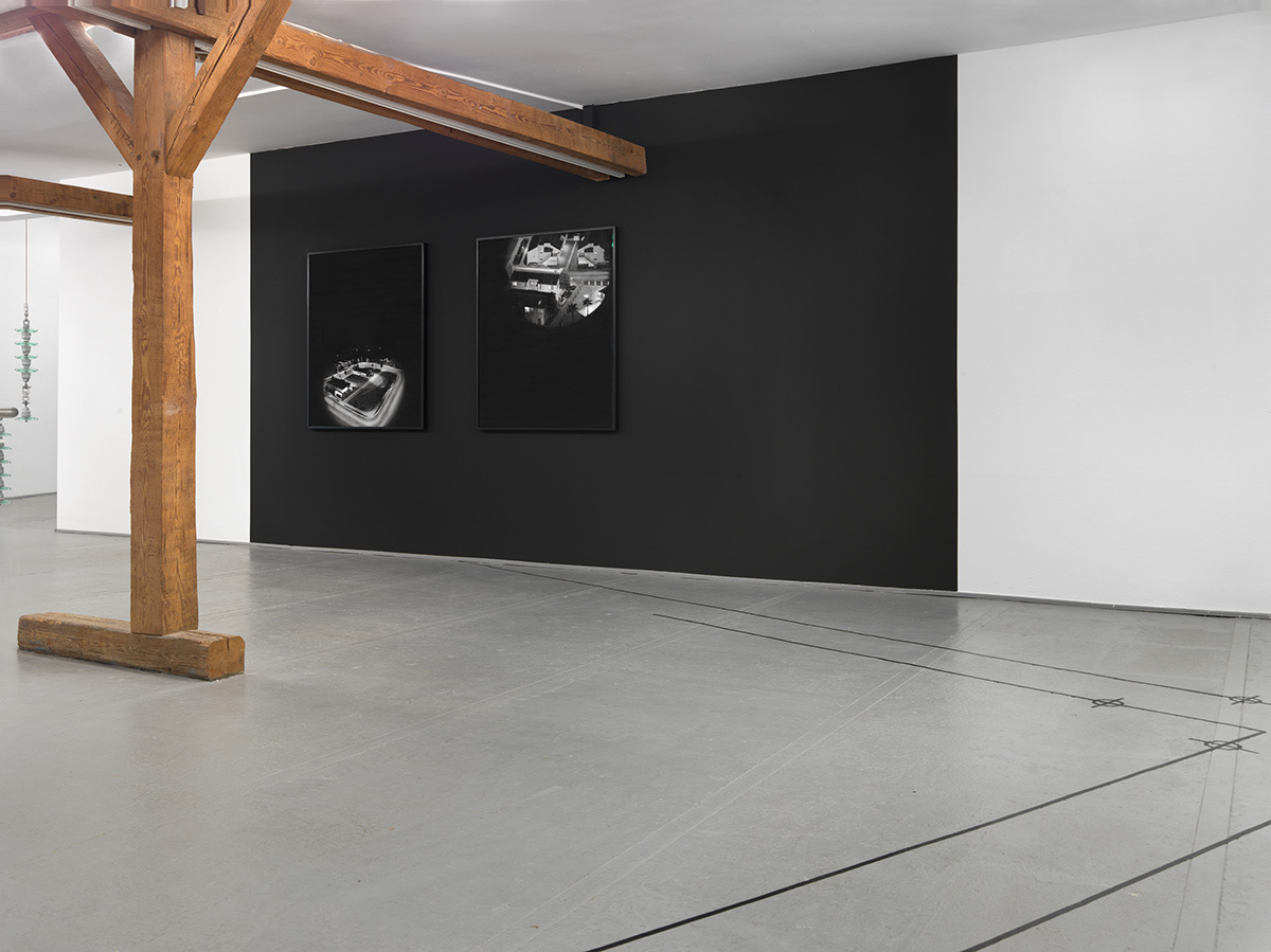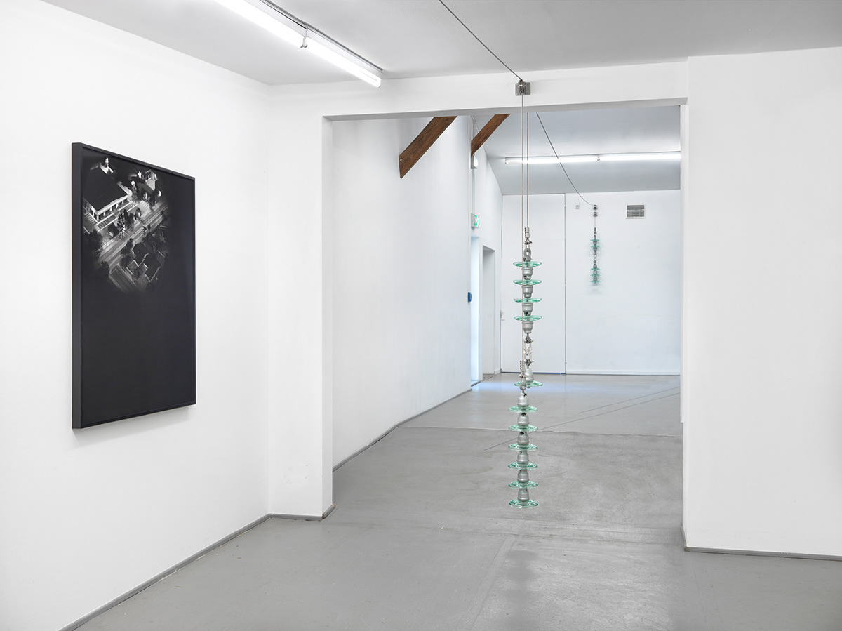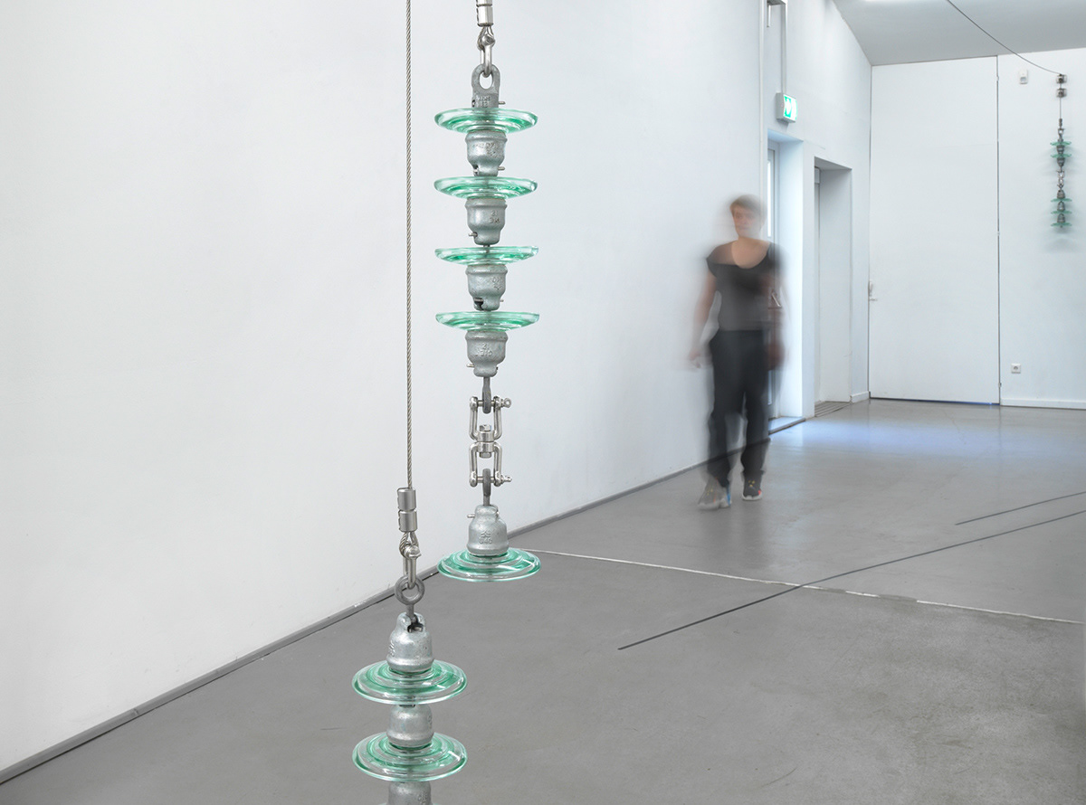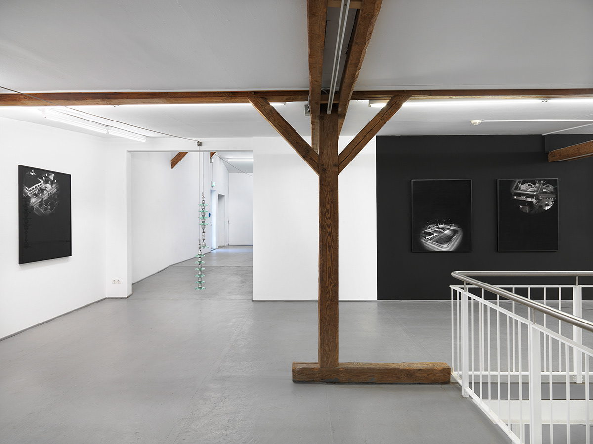 Exhibition views: Natalia Stachon. Worddust everywhere, Kunstverein und Stiftung Springhornhof, Neuenkirchen, 2020 / The Problem of the Calm (Kunstverein Springhornhof), 2020, insulators, stainless steel accessories, overall size variable, Cross all your skies see the silent writing 06, 2019, Cross all your skies see the silent writing 07, 2019 and Cross all your skies see the silent writing 08, 2019, drawings, charcoal on paper, 95 x 115 each (Photos: Bernd Borchardt)